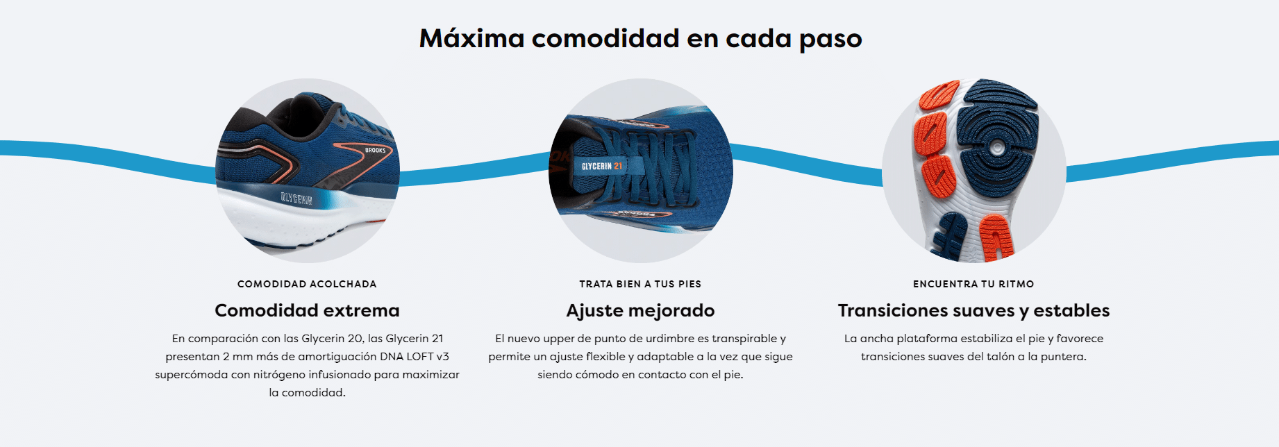 5. Transiciones mucho más suaves: Con un drop de 10 mm, las Glycerin 21 presentan una mediasuela más ancha que favorece a la estabilidad del corredor. Además, la transición en la pisada nunca ha sido tan cómoda.
